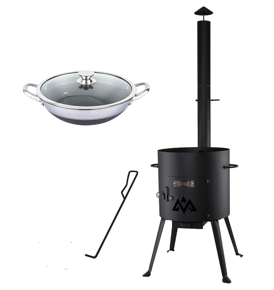 Utschak – kompakter, transportabler Feuerofen aus Stahl mit Schornstein, Ascheschublade und praktischem Schürhaken.
